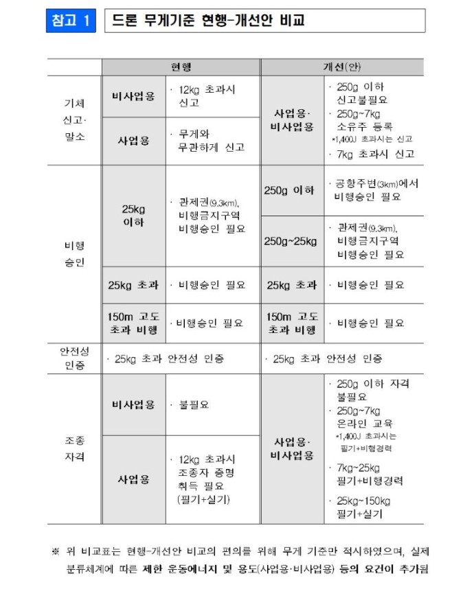 ±¹ÅäºÎ´Â "´Ù¾çÇÑ µå·ÐÀÌ Ãâ½ÃµÇ´Â Ãß¼¼¿¡¼­ ´Ü¼øÈ÷ ¹«°Ô¸¦ ±âÁØÀ¸·Î ÇÑ ÇöÇà µå·Ð ºÐ·ùü°è´Â ¾ÈÀü¼ºÀ» ´ãº¸ÇÏ±â ¾î·Æ°í ¿Ï±¸¡¤·¹Àú¿ë µå·Ð¿¡´Â ±ÔÁ¦·Î ÀÛ¿ëÇÒ ¼ö ÀÖ¾î À̸¦ °³¼±Çϱâ·Î Çß´Ù"°í ¸»Çß´Ù.